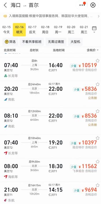 在社交平臺(tái)上,一些網(wǎng)友還提供了“聯(lián)程甩尾”方案。例如,從??谥憋w北京,16日票價(jià)要近萬(wàn)元,但如果選擇海口飛往首爾,從北京中轉(zhuǎn),票價(jià)最低僅需五千多元。
