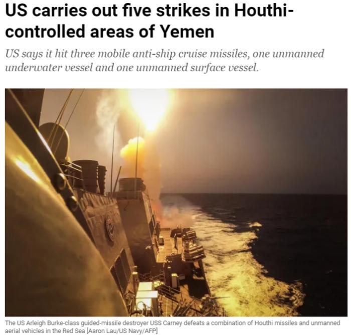 美國(guó)對(duì)胡塞武裝連續(xù)發(fā)動(dòng)五次空襲 擊中多枚導(dǎo)彈和艦艇