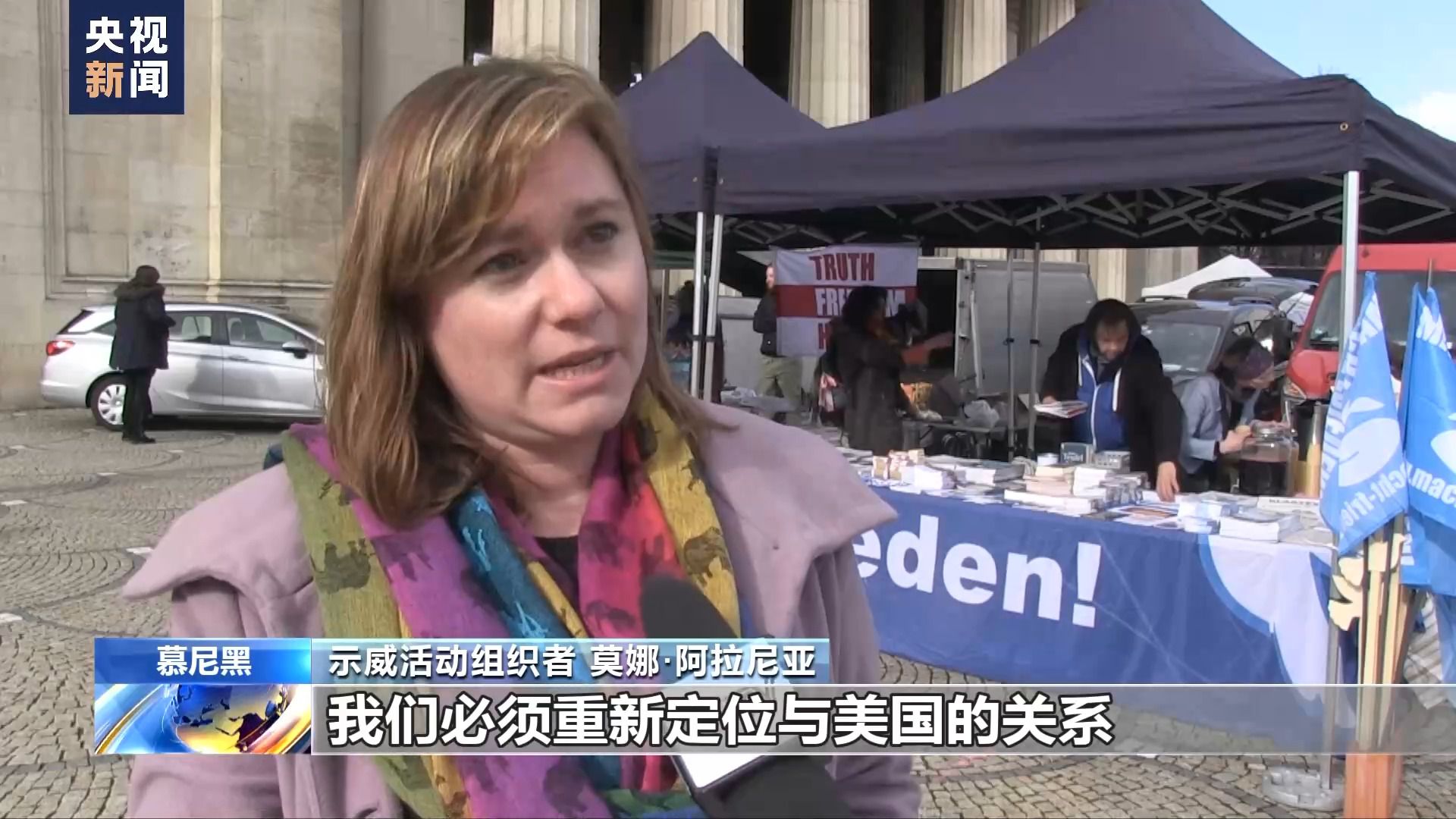 示威活動組織者 莫娜·阿拉尼亞:我們必須重新定位與美國的關(guān)系,重新定位與俄羅斯的關(guān)系,歐洲安全與和平架構(gòu)需要與俄羅斯一起建立,而不是與俄羅斯敵對。