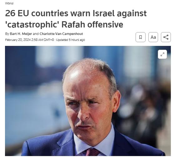 據(jù)報道,目前拉法已經(jīng)涌入了約150萬加沙地帶難民,愛爾蘭外長馬丁表示:“對拉法的進攻絕對是災難性的”。