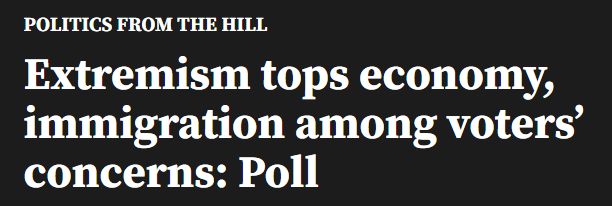 調(diào)查發(fā)現(xiàn),21%的受訪者表示“政治極端主義或者民主所受到的威脅”是他們最為擔心的問題,其次才是經(jīng)濟問題和移民問題,后兩者占比分別為19%和18%。