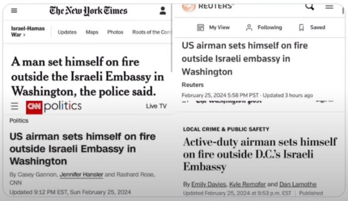 其中紐時的標題最為極品——《警方表示:一男子在華盛頓的以色列使館外自焚》