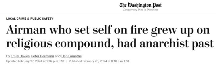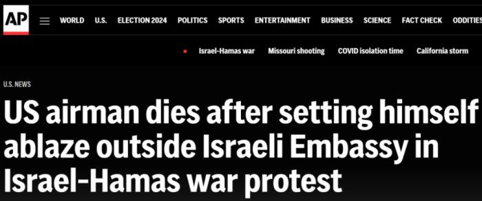 2月25日在以色列駐美大使館門前自焚身亡以抗議美以在加沙進行種族滅絕的25歲現(xiàn)役美空軍亞倫·布什內(nèi)爾,以身證道,成了近期震驚世界的事件。關于這位義士的生平簡介、抗議行動本身和以后的價值、意義,這兩天想必各位也聽了、看了不少了,今天烏鴉來談談這次自焚抗議事件發(fā)生后,也許更加值得細品的一些狀況。