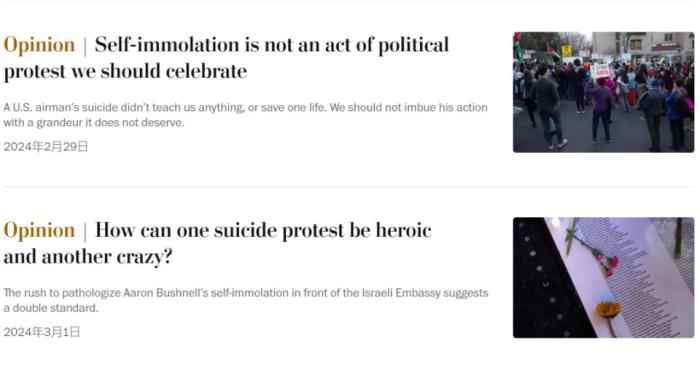 一篇題為《自焚不是政治抗議的表達手段我們不應為之慶?!?,另一篇為《同樣是自殺抗議為什么有的是英雄有的卻是瘋子》。