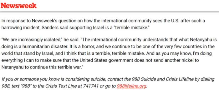 另一家媒體《新聞周刊》,現(xiàn)在則會在每一篇有關布什內(nèi)爾的文章文末附上預防自殺熱線的信息。比如下面這篇文章只是關于美國左翼議員伯尼·桑德斯對布什內(nèi)爾事件的評論,內(nèi)容跟布什內(nèi)爾本人其實無甚關系,也要附上這么一段……