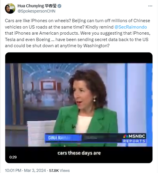 3月3日,華春瑩在社交媒體上發(fā)文回應美方這番言論,“汽車就像是裝了輪子的iPhone(蘋果手機)?北京能讓美國道路上的數(shù)百萬中國汽車同時熄火?友好提醒一下,iPhone是美國產(chǎn)品。你是不是在暗示iPhone、特斯拉甚至波音……一直在將機密數(shù)據(jù)傳送回美國,隨時可能被華盛頓關停?”