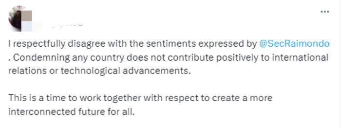 還有網(wǎng)友表示,譴責任何國家,不會對國與國之間的關系和科技進步帶來積極貢獻,“現(xiàn)在是時候共同努力,為所有人創(chuàng)造一個更好溝通的未來?!?/p>