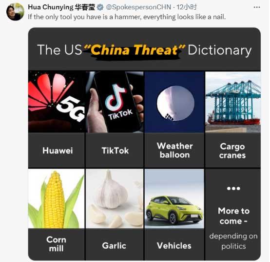 華春瑩最后回擊,“如果你唯一的工具是錘子,那么所有東西看起來都像釘子。”這條帖文隨附圖片上,列出美國以往炒作“中國威脅”的詞典:包括華為,TikTok,氣象無人飛艇,起重機,玉米加工廠,大蒜,汽車……還有更多,取決于政治因素。↓