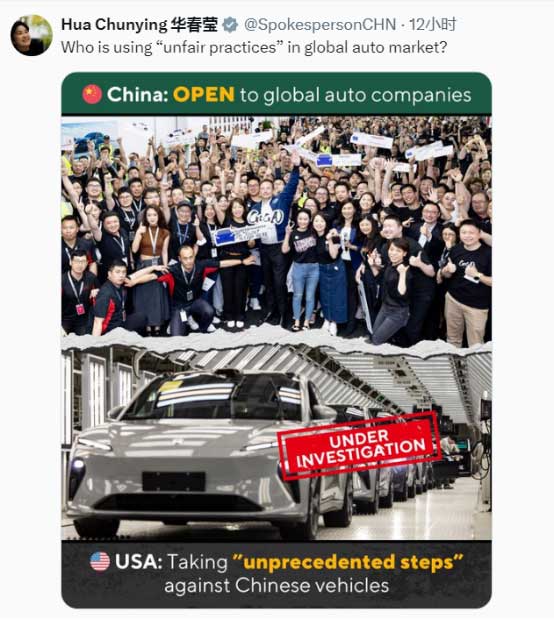 她隨后發(fā)表圖文,對比中美在汽車行業(yè)的行為問道,“是誰在全球汽車市場采取‘不公平做法’?”圖片顯示,中國的做法是“向全球車企”開放,而美國正針對中國汽車采取“前所未有的措施”。↓