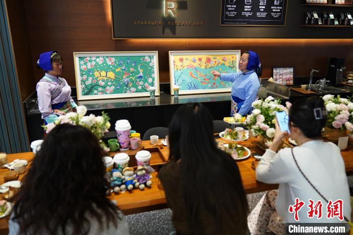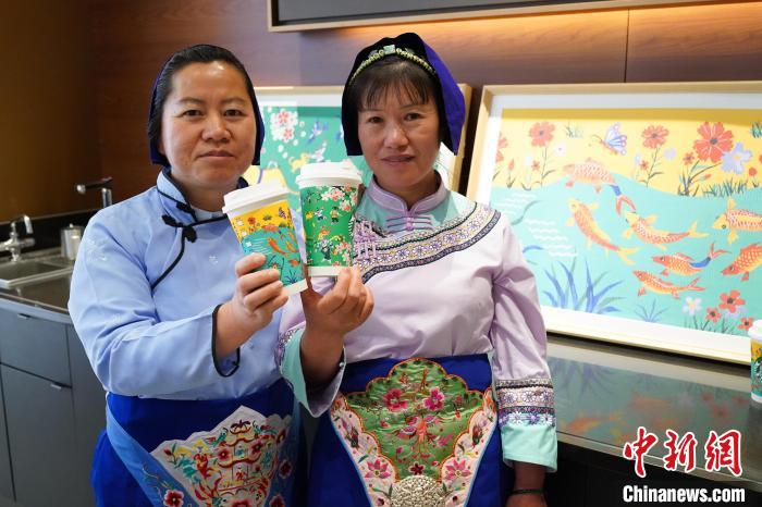 圖為農(nóng)民畫家展示她們被印在星巴克咖啡紙杯上的畫作。中新網(wǎng)記者 劉冉陽 攝