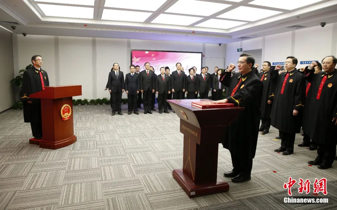 2019年1月1日,中國最高人民法院知識(shí)產(chǎn)權(quán)法庭在北京揭牌成立,最高法知識(shí)產(chǎn)權(quán)法庭全體法官進(jìn)行憲法宣誓。李慧思 攝