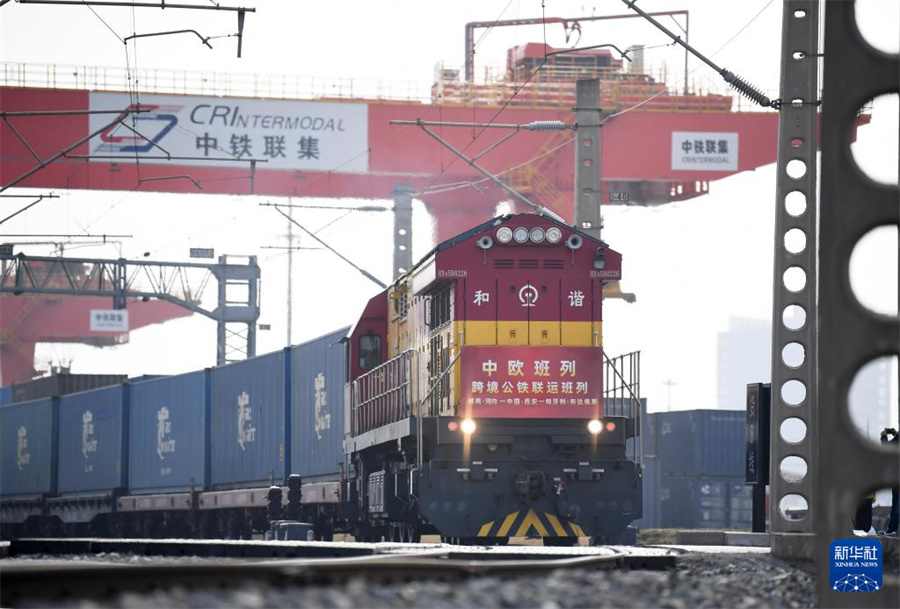 3月7日,中歐班列(越南·河內(nèi)——中國·西安——匈牙利·布達佩斯)跨境公鐵聯(lián)運班列從西安國際港站駛出。新華社記者 李一博 攝
