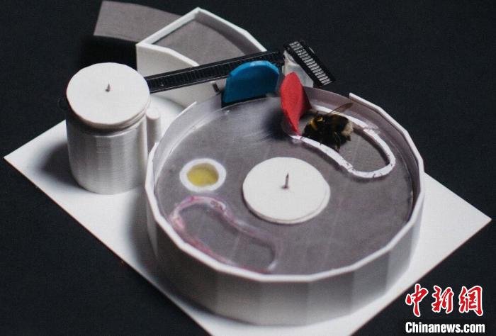 這個(gè)兩步謎題盒中黃色圓圈位置有一滴糖水,透過透明塑料蓋可以看到。要獲得獎(jiǎng)勵(lì)蜜蜂必須推動(dòng)紅色標(biāo)簽旋轉(zhuǎn)透明蓋子,直到標(biāo)簽后的月牙形開口位于黃色液滴上方。不過只有先推開藍(lán)色標(biāo)簽,才能移動(dòng)紅色標(biāo)簽。(圖片來自倫敦瑪麗女王大學(xué))。施普林格·自然/供圖