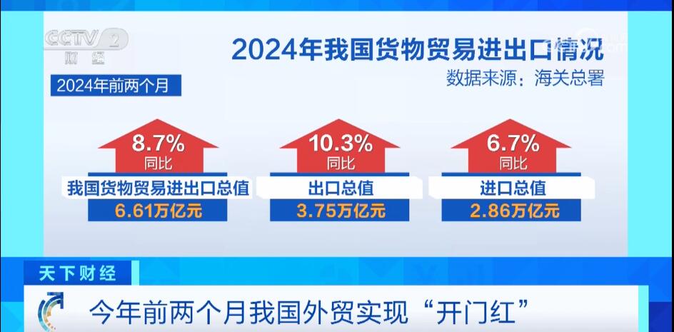 央視網(wǎng)消息:海關(guān)總署3月7日發(fā)布,今年前2個(gè)月,我國(guó)貨物貿(mào)易進(jìn)出口同比增長(zhǎng)8.7%,出口更是達(dá)到兩位數(shù)增長(zhǎng),外貿(mào)實(shí)現(xiàn)“開(kāi)門(mén)紅”。