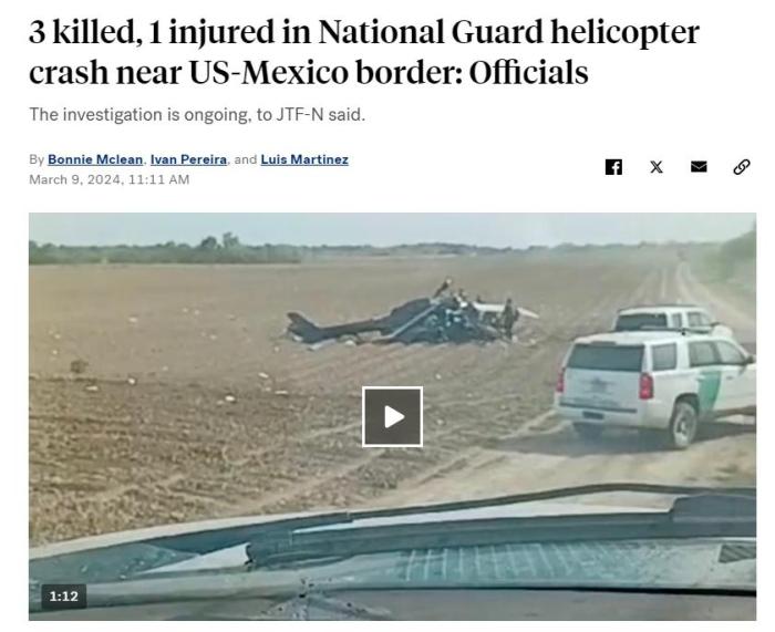 中新網(wǎng)3月9日電 據(jù)美媒報(bào)道,當(dāng)?shù)貢r(shí)間3月8日,一架美國國民警衛(wèi)隊(duì)直升機(jī)在美墨邊境附近墜毀,造成3人死亡、1人受傷。