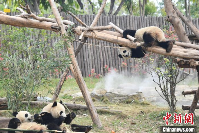2023年3月31日,四川省成都市,成都大熊貓繁育研究基地內(nèi)的一只大熊貓爬上樹干探出腦袋,仿佛在與同伴玩游戲。中新社記者 張浪 攝