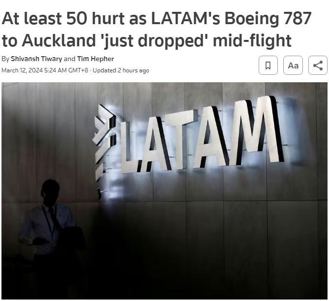 當(dāng)時(shí), 總部位于智利的拉塔姆航空公司一架從澳大利亞悉尼飛往新西蘭奧克蘭的波音飛機(jī),因技術(shù)問題,在飛行途中急降,“劇烈俯沖”數(shù)秒,導(dǎo)致乘客撞上機(jī)艙頂,造成至少50人受傷。