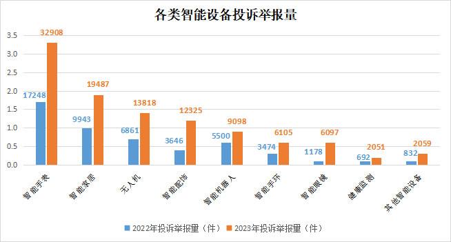 隨著物聯(lián)網(wǎng)、人工智能、5G通信等技術(shù)的突破,智能設(shè)備不斷更新迭代。各類可穿戴智能設(shè)備、智能家居越來越受到消費(fèi)者的青睞,相關(guān)消費(fèi)糾紛增長較快。2023年,全國12315平臺(tái)共接收智能設(shè)備投訴舉報(bào)10.4萬件,同比增長1.1倍。其中智能手表(3.3萬件)、智能家居(1.9萬件)投訴舉報(bào)較多;智能眼鏡、智能配飾類別增長較快,分別同比增長4.2倍、2.4倍。消費(fèi)者反映問題主要集中在售后服務(wù)困難、泄露消費(fèi)者個(gè)人信息、產(chǎn)品實(shí)際功能與宣傳不符等。