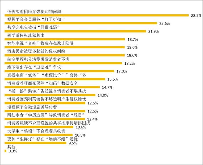 中新網(wǎng)3月14日電(中新財(cái)經(jīng)記者 謝藝觀)3月14日,中國(guó)消費(fèi)者協(xié)會(huì)對(duì)外發(fā)布2024年“激發(fā)消費(fèi)活力”消費(fèi)維權(quán)年主題調(diào)查報(bào)告,調(diào)查結(jié)果顯示,低價(jià)旅游團(tuán)暗存強(qiáng)制購(gòu)物、視頻平臺(tái)會(huì)員服務(wù)“打了折扣”、共享充電寶“好借難還”引共鳴。