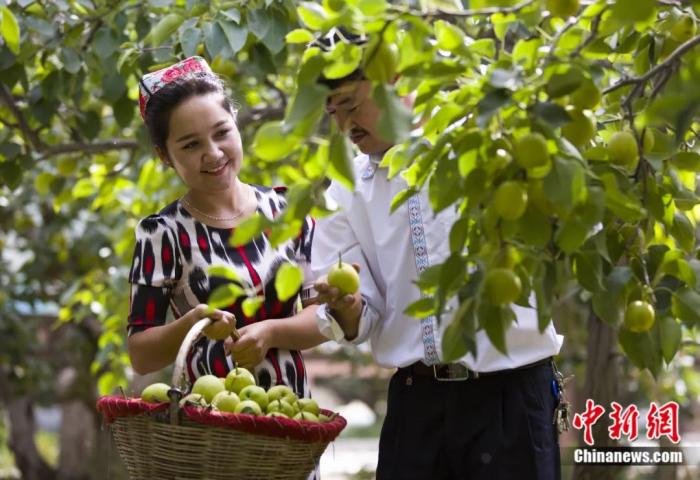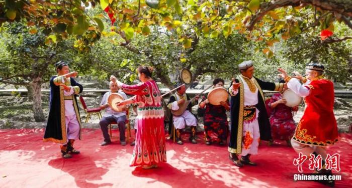 香梨成熟的季節(jié),當(dāng)?shù)卮迕裣灿憷娉墒欤瑲g快起舞。姚謙 攝