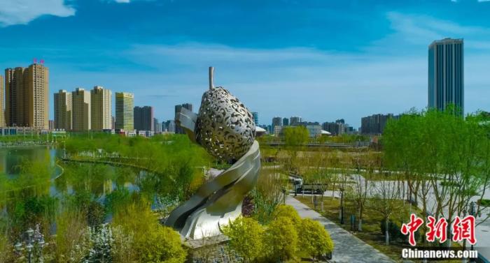 庫(kù)爾勒天鵝河畔孔“庫(kù)爾勒香梨雕塑”。 文興華攝
