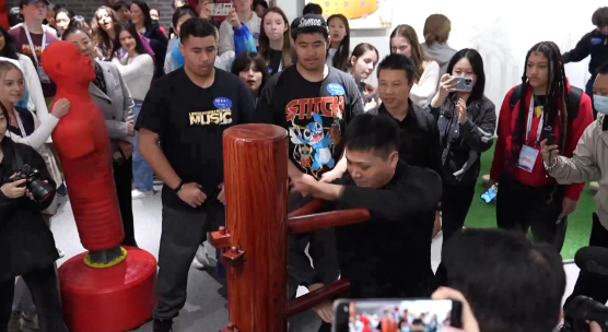 詠春拳木人樁、梅花樁、長矛等武術表演,引來代表團中的學生們踴躍體驗。