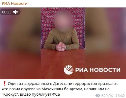 “我給那些襲擊了莫斯科‘克羅庫斯城’音樂廳的人帶去了武器。武器是我從馬哈奇卡拉帶到梅季希的?!逼渲幸蝗吮硎尽?/p>