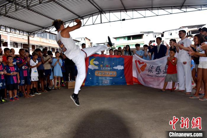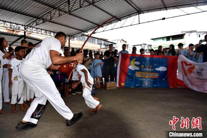 當?shù)貢r間3月23日,巴西里約熱內(nèi)盧石頭河社區(qū),巴西“戰(zhàn)舞”舞者為來自加拿大的華僑華人小朋友表演?!≈行律缬浾?林春茵 攝