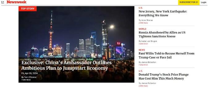 據(jù)中國(guó)駐美國(guó)大使館網(wǎng)站消息,4月5日,中國(guó)駐美國(guó)大使謝鋒就“新質(zhì)生產(chǎn)力”和中國(guó)經(jīng)濟(jì)形勢(shì)接受美國(guó)《新聞周刊》(Newsweek)高級(jí)外交政策記者湯姆·奧康納專訪,訪談內(nèi)容當(dāng)日在該周刊網(wǎng)站刊登。
