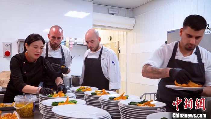 2024年2月22日,夏蓉(左)與巴塞羅那洲際酒店的廚師團隊合作為宴會制作中餐。受訪者供圖