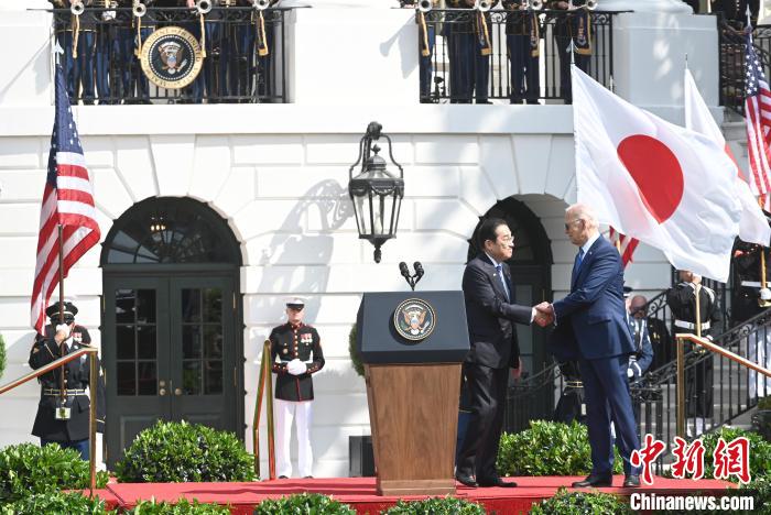當(dāng)?shù)貢r間4月10日,美國總統(tǒng)拜登與來美國事訪問的日本首相岸田文雄在白宮舉行會晤。圖為雙方出席白宮歡迎儀式。中新社記者 陳孟統(tǒng) 攝