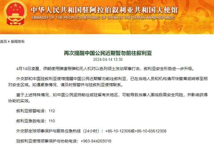使館消息稱,4月14日凌晨,伊朗使用彈道導(dǎo)彈和無人機(jī)對以色列領(lǐng)土發(fā)動(dòng)軍事打擊,敘利亞安全形勢進(jìn)一步升級。