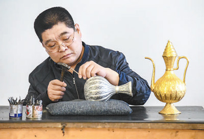 “花絲鑲嵌工藝是一項(xiàng)融合藝術(shù),集掐絲、鏨刻、鑲嵌等工藝為一體?!瘪R福良介紹,河北大廠花絲鑲嵌制作技藝的歷史可上溯到漢代,隨著歷史的發(fā)展,融合了多民族、多地域的技藝特點(diǎn),形成了獨(dú)具特色的花絲工藝品。如今,大廠回族自治縣已成為我國(guó)北方地區(qū)花絲鑲嵌工藝品生產(chǎn)和出口基地。2008年,花絲鑲嵌制作技藝被列入國(guó)家級(jí)非物質(zhì)文化遺產(chǎn)名錄。2009年,馬福良成為這一項(xiàng)目的國(guó)家級(jí)代表性傳承人。