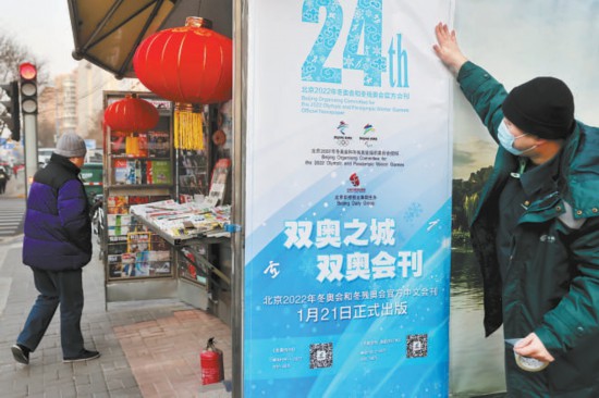 昨天上午,位于廣渠門內(nèi)大街富貴園購物中心前的郵政報刊亭旁,三位來自北京郵政的工作人員正忙碌著。很快,三張印有“雙奧之城,雙奧會刊”“北京2022年冬奧會和冬殘奧會官方中文會刊1月21日正式出版”等字樣的嶄新海報貼上了報刊亭的公益宣傳欄。以白色和藍色為主色調(diào)的主題海報剛剛貼好,就立刻吸引了過往路人的駐足觀看:“這海報真有冬奧氛圍?!薄岸瑠W會刊?到時候得來一份看看。”不少路人掏出手機,對著海報上的預(yù)訂二維碼現(xiàn)場掃碼,了解具體情況。