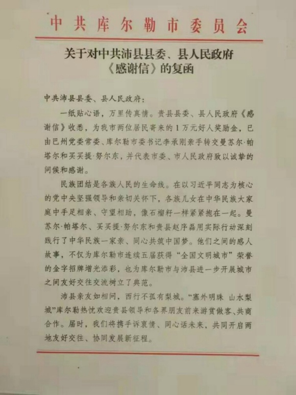 沛縣縣委、縣政府獲悉此事后十分重視,1月2日,以沛縣縣委、縣政府的名義,給新疆維吾爾自治區(qū)庫爾勒市委、市政府發(fā)去了一封感謝信,并從沛縣“好人基金”中拿出1萬元獎金,請庫爾勒市委、市政府轉(zhuǎn)交給曼蘇爾·帕塔爾和買買提·努爾東兩人,以獎勵二人的善行之舉,這才有了本文開頭庫爾勒市給沛縣回應(yīng)“感謝信”復(fù)函那一幕。
