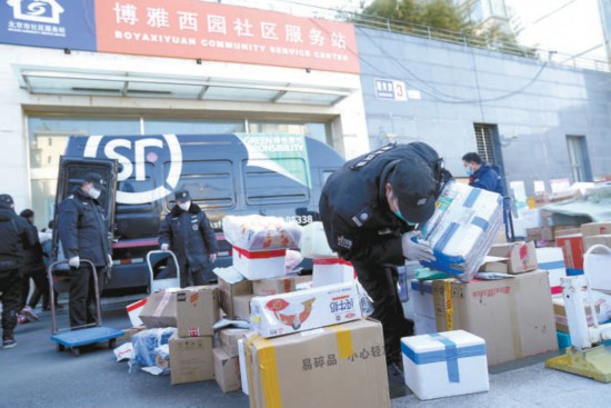 昨天上午,海淀區(qū)上地街道博雅西園社區(qū)門口,工作人員在幫社區(qū)居民轉(zhuǎn)運(yùn)快遞。本報(bào)記者 王海欣攝