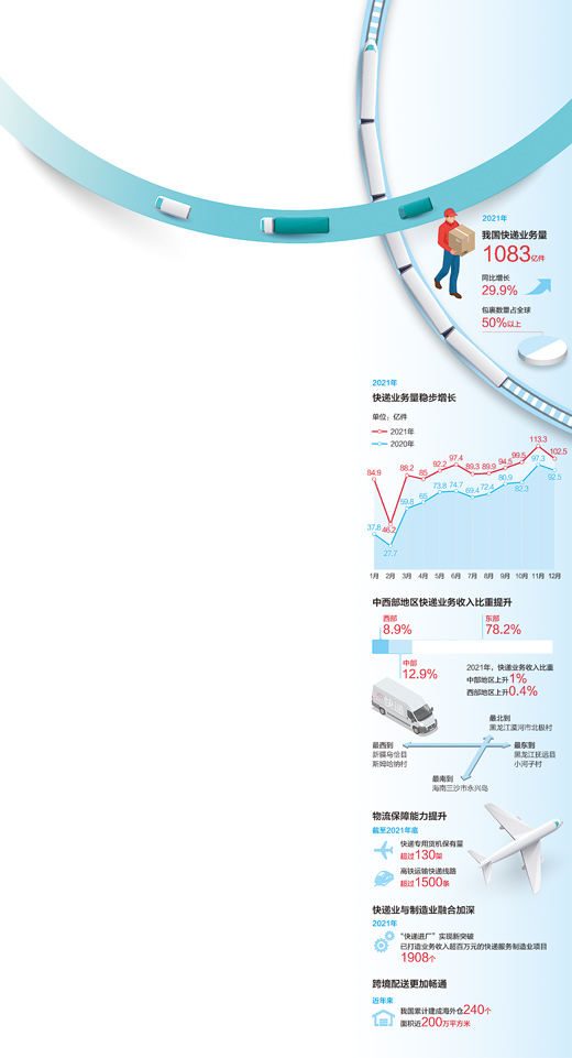 記者從國家郵政局獲悉,2021年全年,我國快遞業(yè)務(wù)量達1083億件,同比增長29.9%,包裹數(shù)量占全球一半以上。