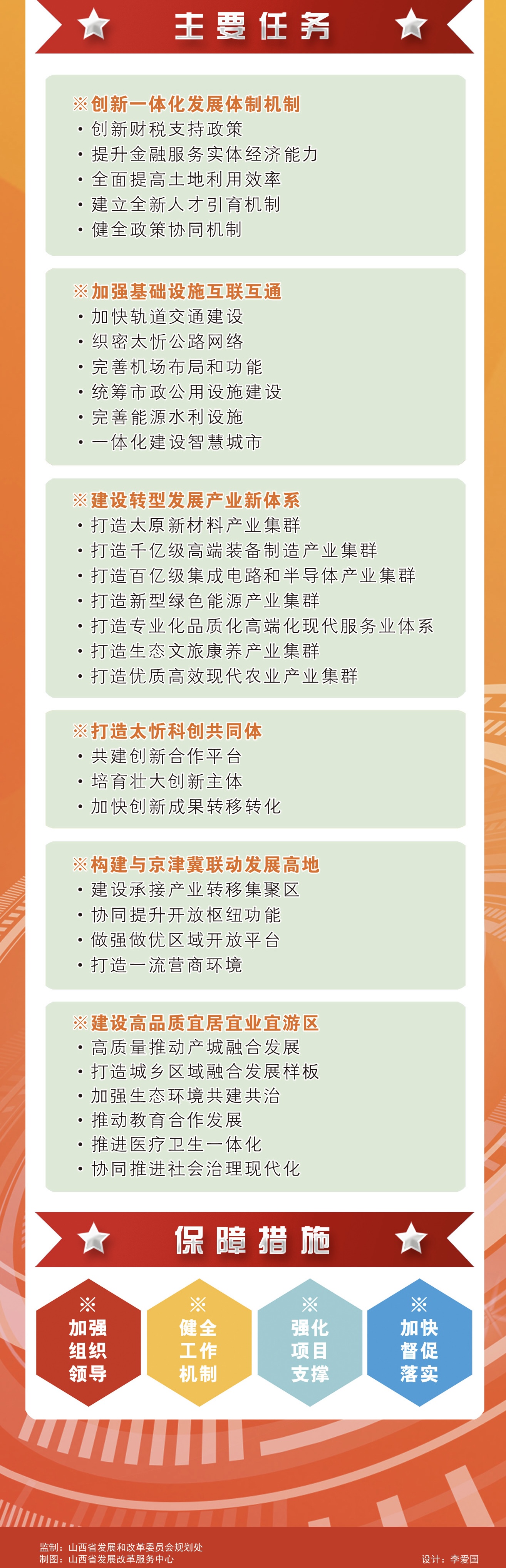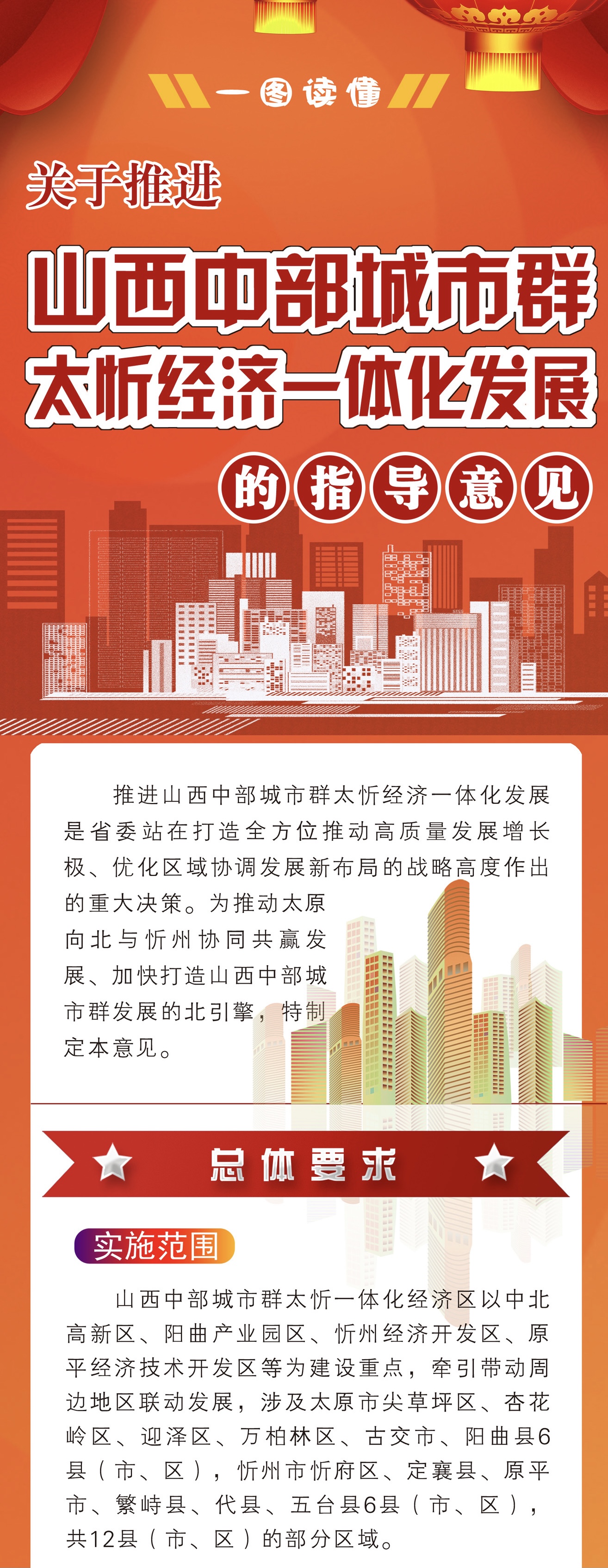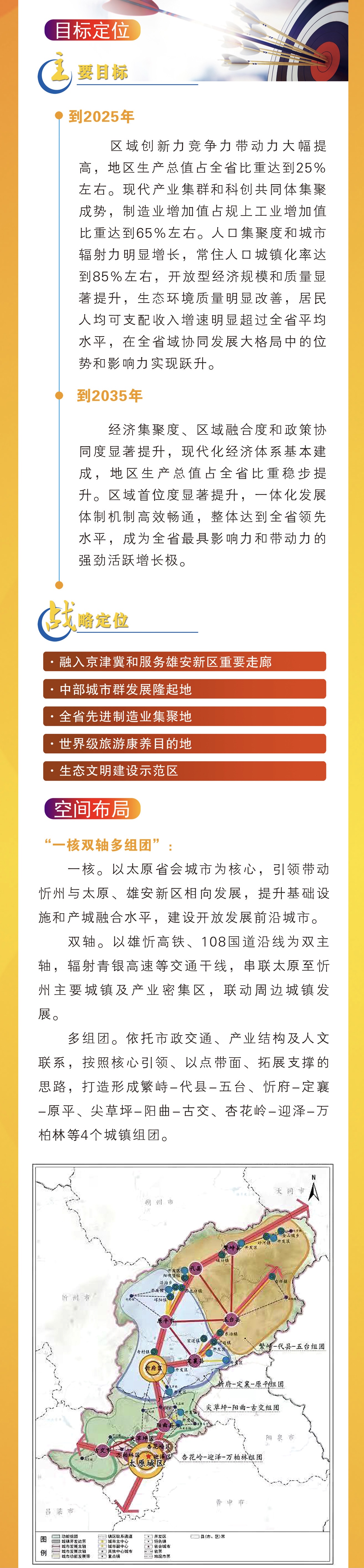 《指導意見》謀劃確定了太忻一體化經(jīng)濟區(qū)的實施范圍,提出了融入京津冀和服務雄安新區(qū)重要走廊、中部城市群發(fā)展隆起地、全省先進制造業(yè)集聚地、世界級旅游康養(yǎng)目的地、生態(tài)文明建設示范區(qū)等五大戰(zhàn)略定位和“一軸雙核多組團”的空間布局,分2025年、2035年兩個時間節(jié)點明確了發(fā)展目標,部署了六個方面的重點任務。