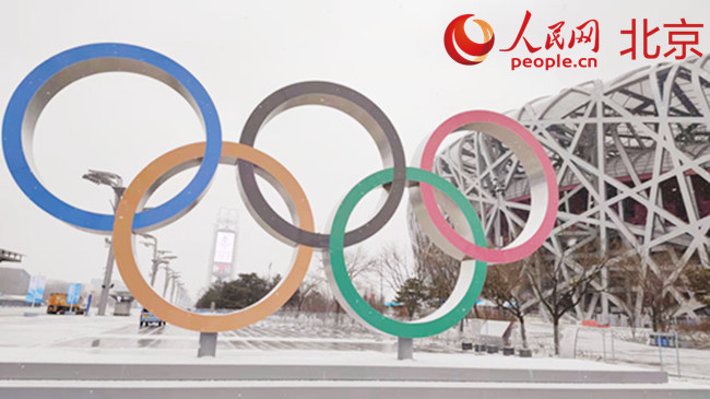 位于“鳥巢”西側(cè)的“奧運(yùn)五環(huán)”形象景觀。 人民網(wǎng) 李博攝