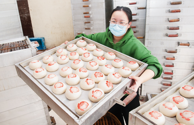 1月23日,金華市金東區(qū)赤松鎮(zhèn)仙橋饅頭店里熱氣騰騰,員工給剛蒸好的饅頭上蓋上紅印,寓意著新年“團團圓圓、蒸蒸日上”。隨著新春佳節(jié)臨近,赤松鎮(zhèn)仙橋各家饅頭店迎來了節(jié)前銷售高峰,饅頭夾扣肉、夾臭豆腐被稱作“金華漢堡”,成為春節(jié)餐桌上一道地方特色餐點。益泰饅頭店主人錢建濤表示,銷量主要集中在春節(jié)前一星期左右,晝夜不停一天要做5萬只以上。(時寬兵)