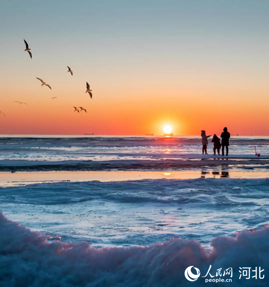 寒冬時節(jié),秦皇島銀裝素裹,冰雪與大海相遇,猶如一幅水墨丹青畫。沿著海岸線伸展而去的海冰,如鑲嵌在沙灘上的一道玉帶,與冬日的大海、沙灘相映成趣。