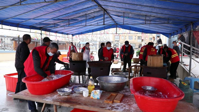 春節(jié)臨近,溫州瑞安城鄉(xiāng)到處洋溢著過年的濃厚氛圍。瑞安南濱街道團(tuán)前村文化禮堂前熱鬧非凡,香氣四溢,村民們正忙碌地?fù)v著年糕。