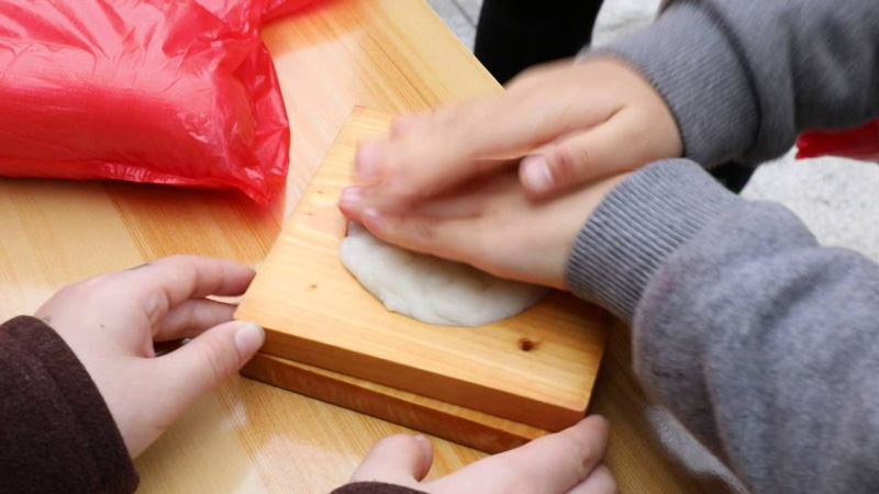 小朋友將糕團(tuán)放入模具中壓印,年糕就制作出來了。有的小朋友則直接用手將糕團(tuán)捏成各式各樣的造型,別有一番樂趣。