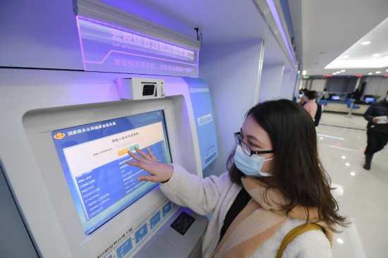 2021年1月15日,在國(guó)家稅務(wù)總局福州市臺(tái)江區(qū)稅務(wù)局辦稅服務(wù)廳,一名企業(yè)員工通過(guò)自助終端查詢納稅信用等信息。新華社記者 宋為偉 攝
