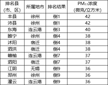 PM2.5濃度相對(duì)較差的后10位(倒1-10名)依次是:豐縣(沛縣并列)、東海、睢寧(沭陽、泗洪并列)、贛榆(泗陽并列)、江陰(邳州、灌云并列)。
