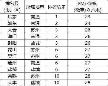 PM2.5濃度相對(duì)較好的前10位(1-10名)依次是:?jiǎn)|、如東、太倉(海門、射陽并列)、昆山(吳江、通州、鹽都并列)、常熟(大豐并列)。