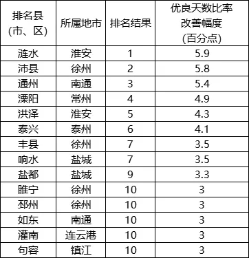 優(yōu)良天數(shù)比率改善幅度相對(duì)較好的前10位(1-10名)依次是:漣水、沛縣、通州、溧陽、洪澤、泰興、豐縣(響水并列)、鹽都、睢寧(邳州、如東、灌南、句容并列)。
