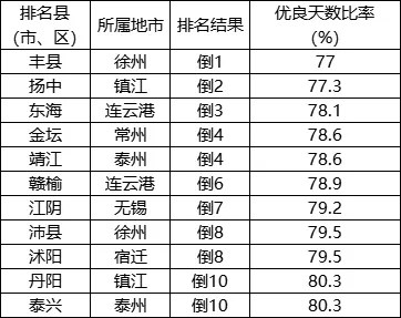 優(yōu)良天數(shù)比率相對(duì)較差的后10位(倒1-10名)依次是:豐縣、揚(yáng)中、東海、金壇(靖江并列)、贛榆、江陰、沛縣(沭陽并列)、丹陽(泰興并列)。