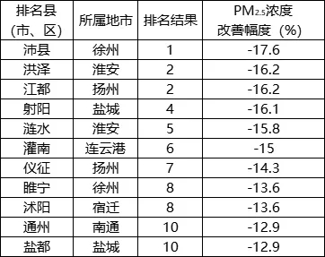 PM2.5濃度改善幅度相對(duì)較好的前10位(1-10名)依次是:沛縣、洪澤(江都并列)、射陽、漣水、灌南、儀征、睢寧(沭陽并列)、通州(鹽都并列)。