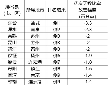 優(yōu)良天數(shù)比率改善幅度相對(duì)較差的后10位(倒1-10名)依次是:東臺(tái)、溧水、常熟(昆山、靖江并列)、儀征、灌云、丹陽、高淳(贛榆并列)